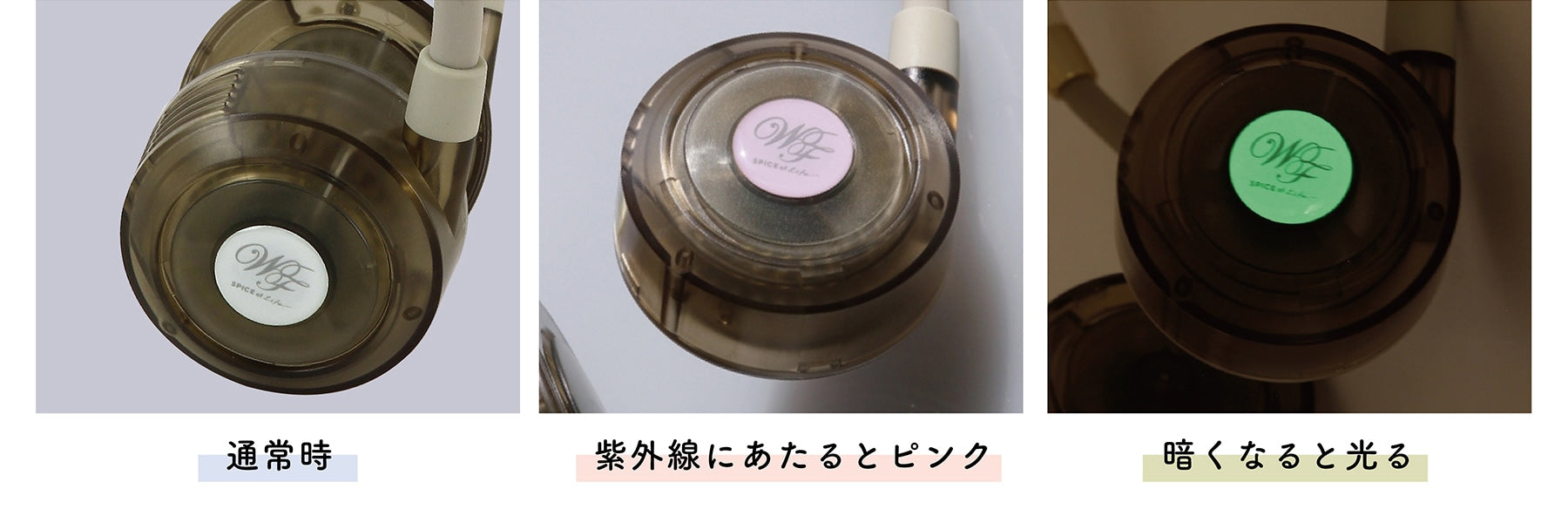 ・ファンの中心にあるシールは、UVチェッカーシールになっていて紫外線が当たるとピンク色に。暗くなると蓄光効果で光ります。