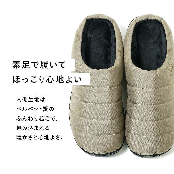 ・ダウンジャケットのようなキルティング素材で足元をふんわり包み、冷え込む朝も暖かな履き心地。