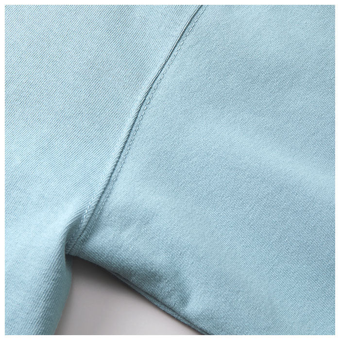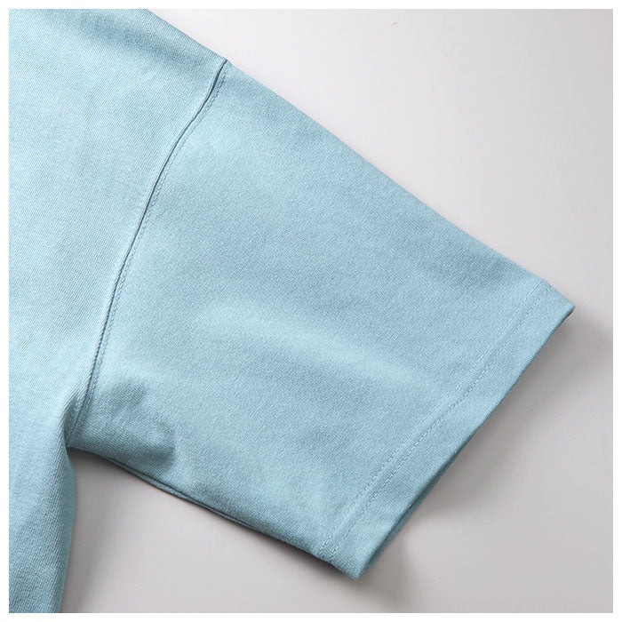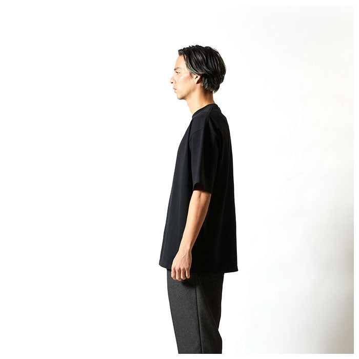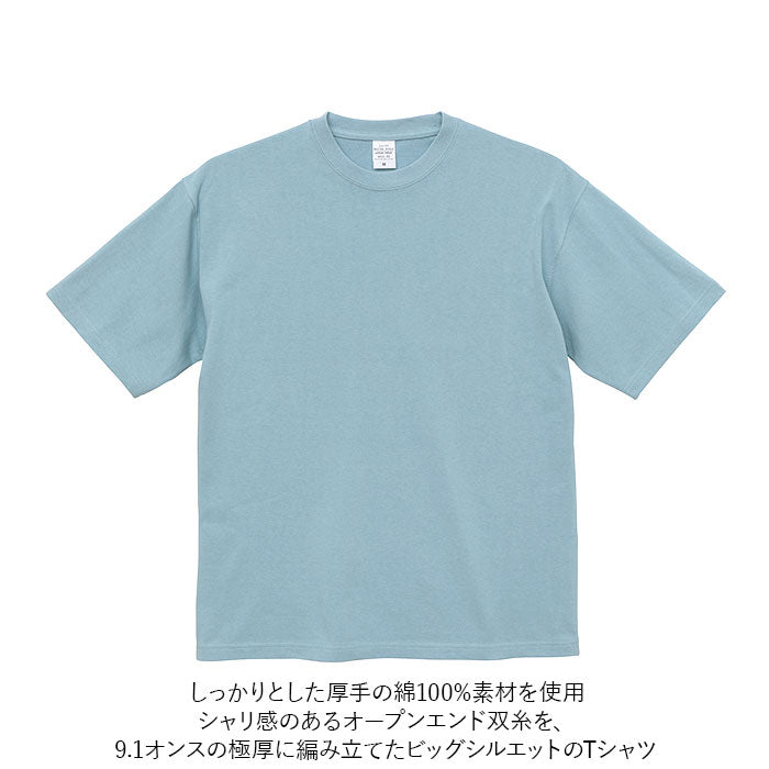 ・しっかりとした厚手の綿100%素材を使用。シャリ感のあるオープンエンド双糸を、9.1オンスの極厚に編み立てたビッグシルエットのTシャツ。(※オープンエンド双糸は空気の流れで撚りを加えて糸にするオープンエンド紡績機で作られており、糸に適度な空気を含み、ガサ感があるのが特徴です。)