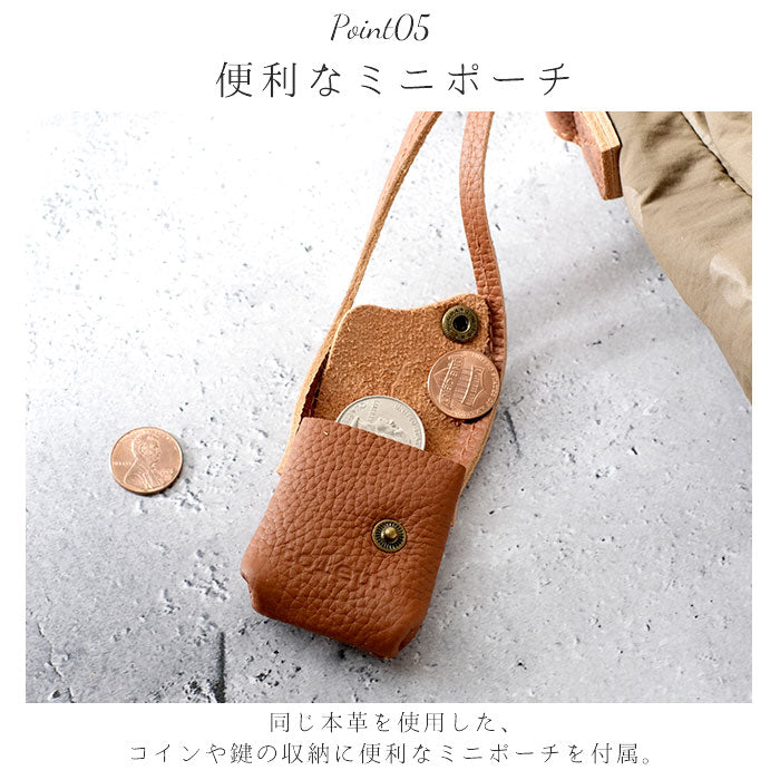 ・同じ本革を使用した、コインや鍵の収納に便利なミニポーチを付属。