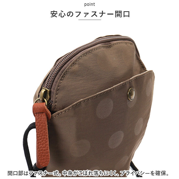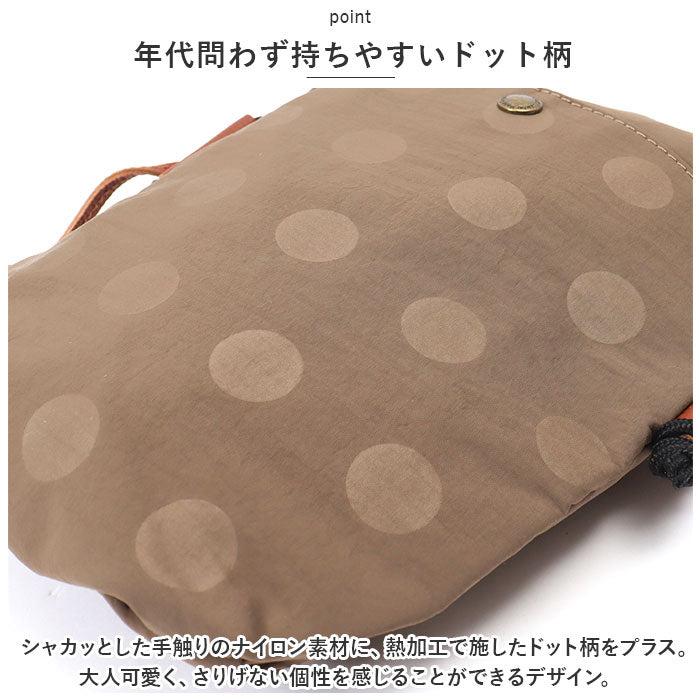 ・シャカッとした手触りのナイロン素材に、熱加工で施したドット柄をプラス。大人可愛く、さりげない個性を感じることができるデザイン。