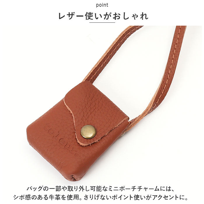 ・バッグの一部や取り外し可能なミニポーチチャームには、シボ感のある牛革を使用。さりげないポイント使いがアクセントに。