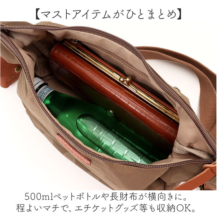 ・500mlペットボトルや長財布が横向きに。程よいマチで、エチケットグッズ等も収納OK。
