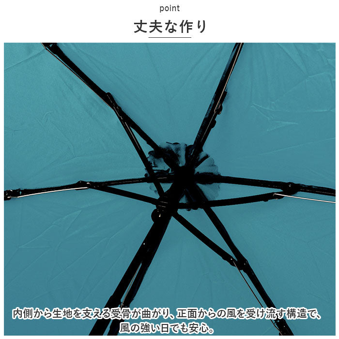 ・内側から生地を支える受骨が曲がり、正面からの風を受け流す構造で、風の強い日でも安心。