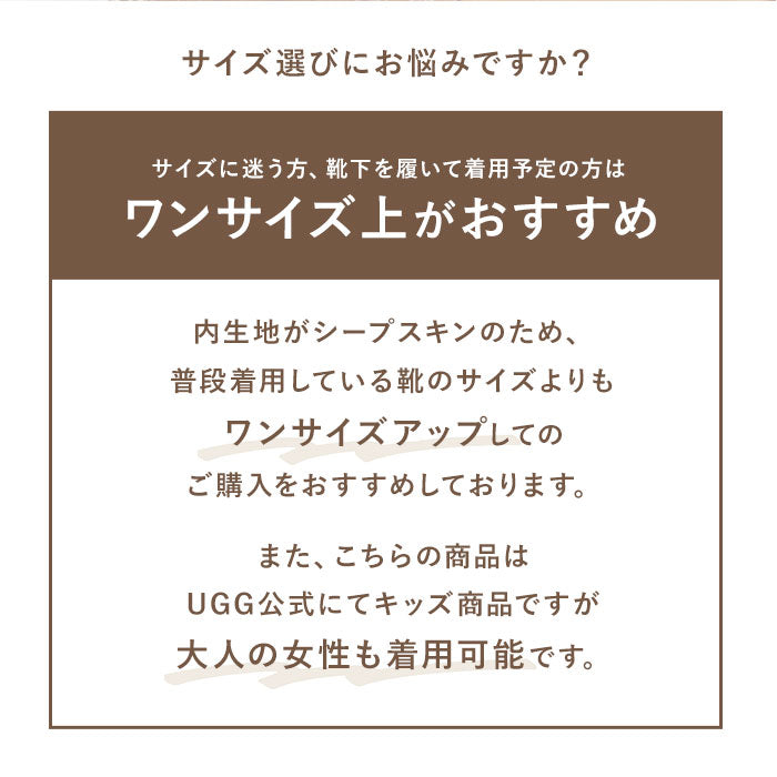 ※こちらの商品はUGGのKIDSモデルです。海外の子供向け規格のため、子供向けサイズとしては大きなつくりですが、日本人の女性に着用しやすいサイズ感となっております。