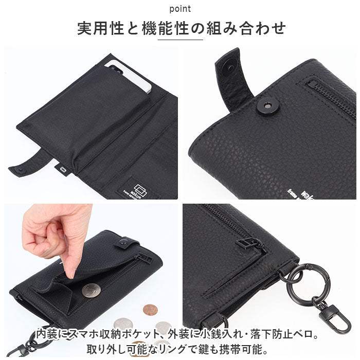 ・内装にスマホ収納ポケット、外装に小銭入れ・落下防止ベロ。取り外し可能なリングで鍵も携帯可能。