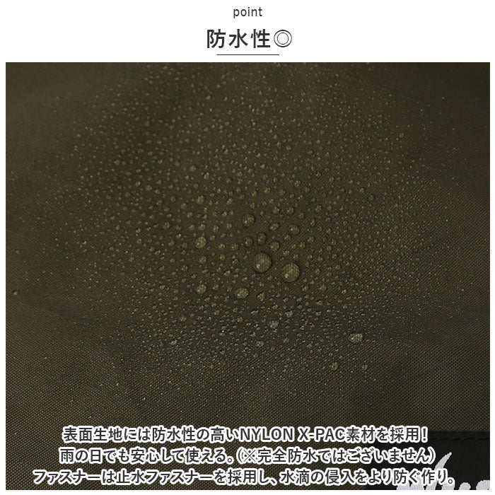 ・表面生地には防水性の高いNYLON X-PAC素材を採用!雨の日でも安心して使える。(※完全防水ではございません)