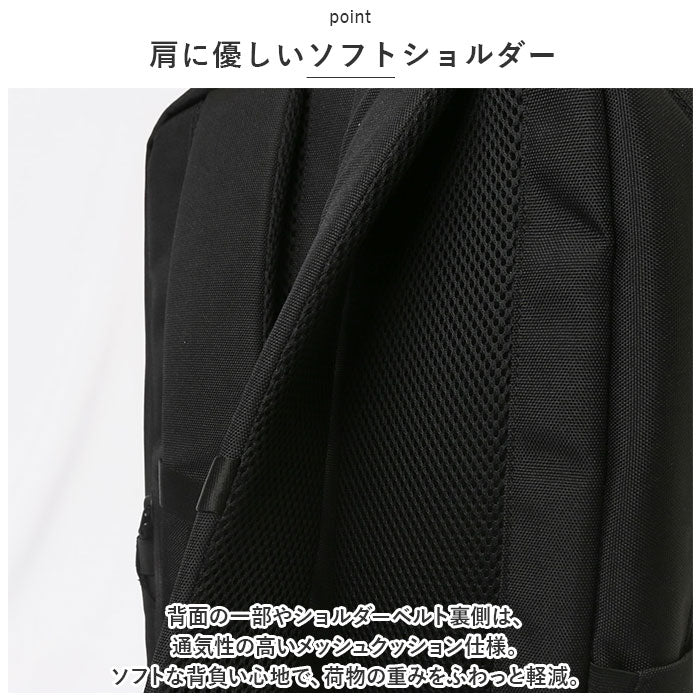 ・背面の一部やショルダーベルト裏側は、通気性の高いメッシュクッション仕様。ソフトな背負い心地で、荷物の重みをふわっと軽減。