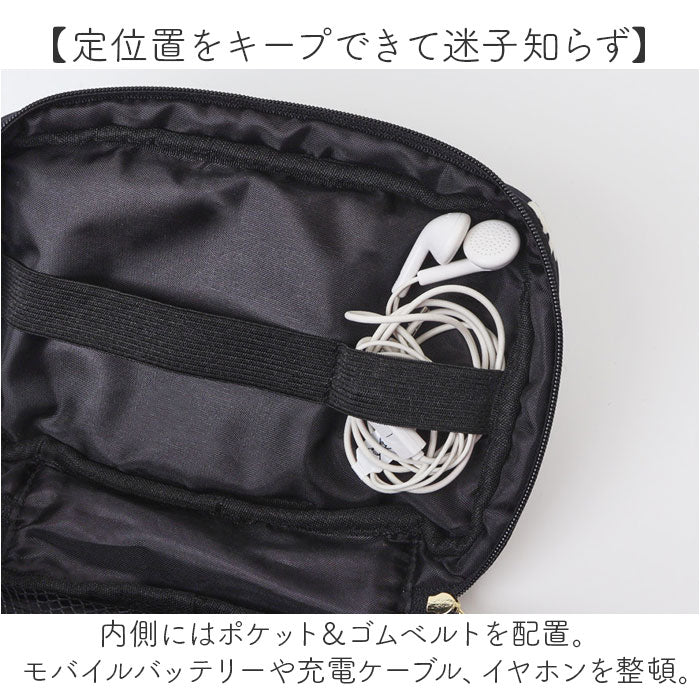 ・内側にはポケット&ゴムベルトを配置。モバイルバッテリーや充電ケーブル、イヤホンを整頓。