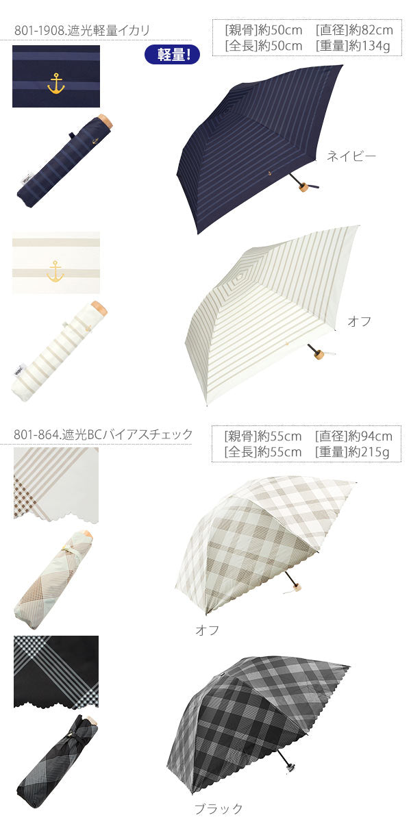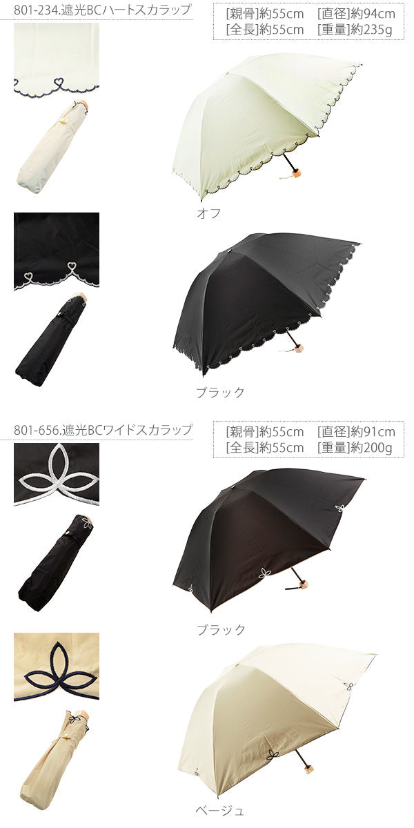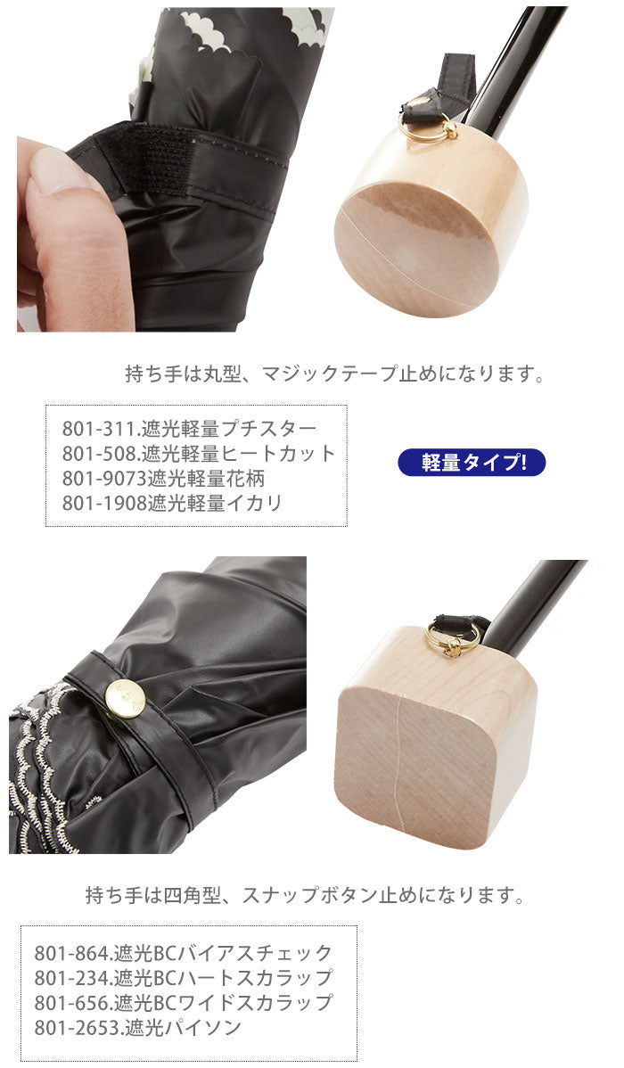 遮光BCバイアスチェック、遮光BCハートスカラップ、遮光BCワイドスカラップは丸みを帯びたフォルムで日差しをしっかりカバー。持ち手は四角型、スナップボタンで留めるタイプになります。