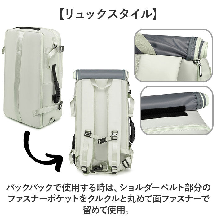 ・バックパックで使用する時は、ショルダーベルト部分のファスナーポケットをクルクルと丸めて面ファスナーで留めて使用。
