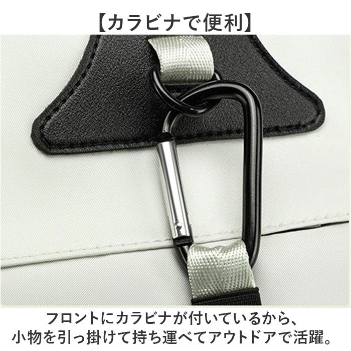 ・フロントにカラビナが付いているから、小物を引っ掛けて持ち運べてアウトドアで活躍。
