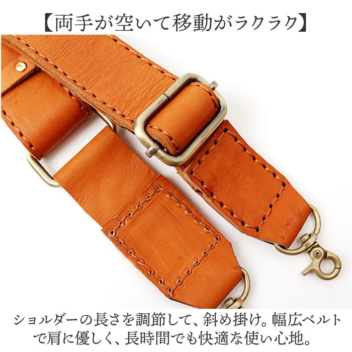 ・ショルダーの長さを調節して、斜め掛け。幅広ベルトで肩に優しく、長時間でも快適な使い心地。